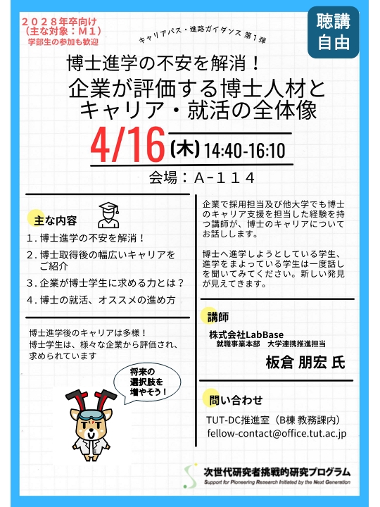 当日は、「近年、注目が集まっている高度博士人材について、産業界は何を求めているのか?」そして、様々な領域で活躍する博士人材の事例を通して、アカデミアだけでない幅広い博士人材のキャリアについて紹介します。皆さん、是非、ふるってご参加ください。
